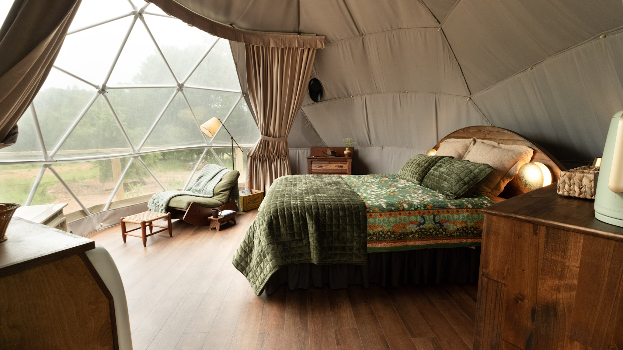 Nestled in the meadow, each geodome offers a queen bed and private porch with sweeping views of the land, along with access to a shared bathhouse.